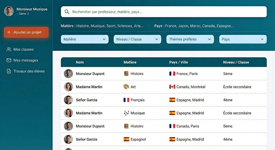 Grâce à un système de matching, NEVYAH connecte deux enseignants dont les projets et les classes sont compatibles (même niveau, thème complémentaire, langue). Une fois la connexion faite, un espace numérique partagé est généré pour leur collaboration.